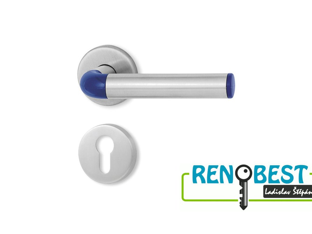 - Toto dveřní kování je dostupné v deseti barevných provedeních s nerezovou rozetou pro cylindrickou vložku (PZ).